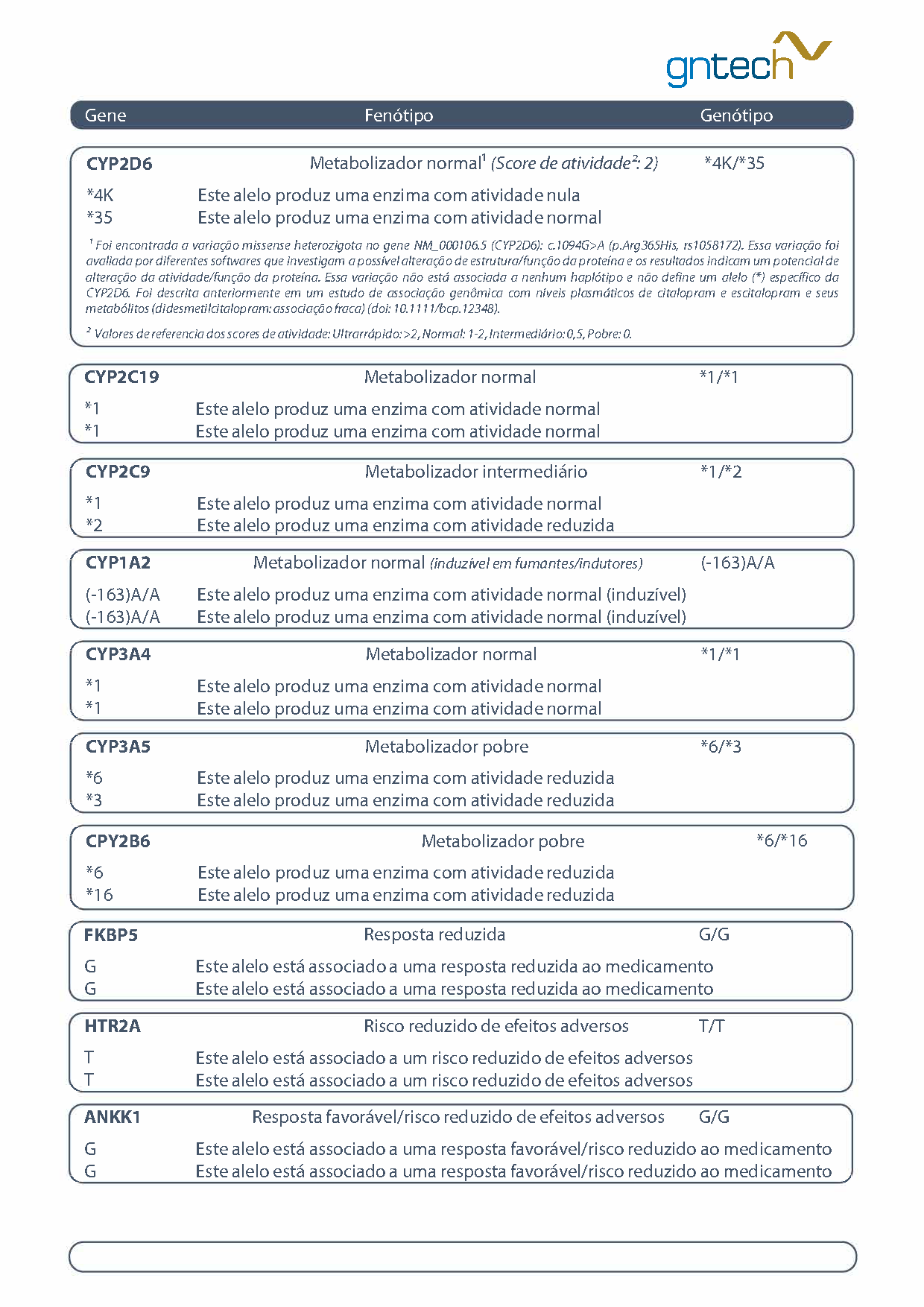 Além de toda robustez científica e da sua relevância na prática clínica, um teste farmacogenético precisa facilitar o seu dia a dia, por isso nossos profissionais aperfeiçoam constantemente a usabilidade do Laudo Farmacogenético da GnTech, otimizando a sua experiência na leitura das informações do seu paciente.